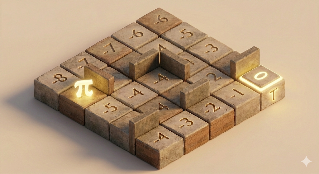 Consider a \(\pi\)-creature (of \(3\)Blue\(1\)Brown fame) symbolizing an agent with policy \(\pi\). This \(\pi\)-creature has to complete a maze. Within the RL framework, this can be modelled as an MDP in which each square is one possible state \(\mathbf x\) of the agent, the maze structure defines the allowed actions \(\mathbf f\) from each state \(\mathbf x\), and one can work with an undiscounted \(\gamma=1\) return in which the reward is \(r_t=-1\) for each action taken. Thus, the optimal policy \(\pi^*\) is a time-independent, deterministic policy \(\mathbf f=\pi^*(\mathbf x)\) that gets the \(\pi\)-creature from its initial state to the terminal state in the fewest number of moves. With that in mind, one can label on top of each square \(\mathbf x\) its corresponding optimal value \(v_{\pi^*}(\mathbf x)\) (note, this image was generated using Nano Banana Pro, some of the calculated values are just wrong but the idea is clear):