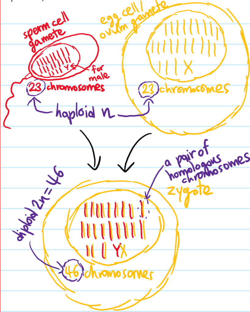Problem: Draw a diagram depicting the process of fertilization. Annotate the terms gamete, zygote, pair of homologous chromosomes, haploid number, and diploid number on the diagram.