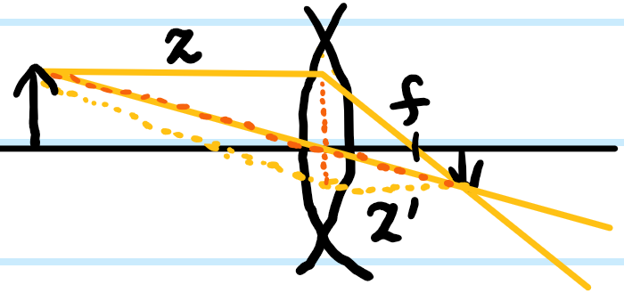 a) Clearly, one can construct a trapezoid with parallel sides of length \(z,z’>0\). But since the diagonals of the trapezoid must intersect at the center of the convex lens, it follows that \(1/f=1/z+1/z’\).