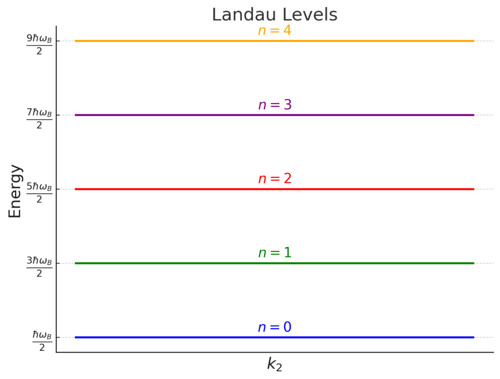 Thus, in the Landau gauge \(\textbf A_{\text{Landau}}\), a quantum-mechanical charged particle moving through a uniform magnetic field along the \(z\)-axis looks like a one-dimensional quantum harmonic oscillator along the \(x\)-axis oscillating at the classical cyclotron frequency \(\omega_B=qB/m\) with center displaced away from the origin at \((k_2\ell_B^2,0,0)\) with \(\ell_B:=\sqrt{\hbar/qB}\) the characteristic length scale of any quantum harmonic oscillator (if \(q<0\) then just take \(|q|\)), in this context called the magnetic length (e.g. for a proton or electron in \(B=1\text{ T}\), it is \(\ell_B=25\text{ nm}\)). The corresponding ladder of quantum harmonic oscillator energies are the Landau energy levels of this charge, quantized in the usual way: