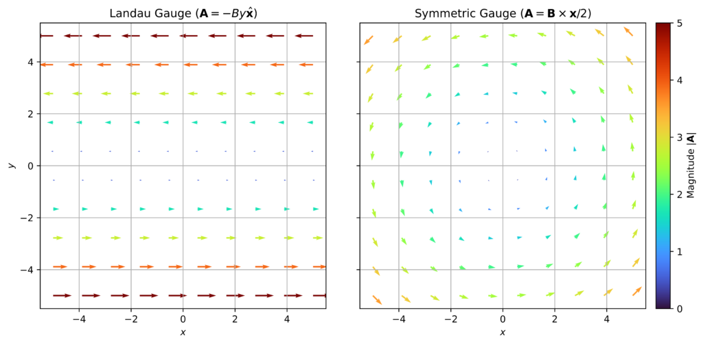 Solution: Physically, one is looking for a “flow field” \(\mathbf A(\mathbf x)\) whose vorticity will generate a \(\textbf B=\frac{\partial}{\partial\textbf x}\times\textbf A\) that points uniformly along \(z\). The \(2\) obvious ways to set this up are either in a “river” manner like \(\mathbf A=-By\hat{\mathbf x}\) or \(\mathbf A=Bx\hat{\mathbf y}\) (both examples of the Landau gauge) or in a “whirlpool” manner like \(\mathbf A=\mathbf B\times\mathbf x/2\) (called the symmetric gauge, cf. familiar fluid mechanics result \(\frac{\partial}{\partial\mathbf x}\times(\boldsymbol{\omega}\times\mathbf x)=2\boldsymbol{\omega}\)).